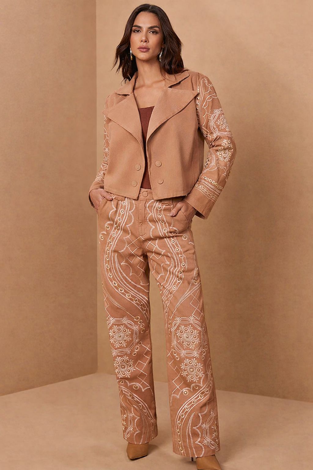 Calça em sarja, modelagem reta, cintura alta com fechamento por botão e zíper, bordado frontal com aplicações métalicas, passantes para cinto, bolsos funcionais tipo faca, bolsos traseiros chapados, tecido estruturado. Uma peça versátil, moderna e sofisticada, ideal para aquelas mulheres de estilo que querem realçar a beleza. Combine com jaqueta do mesmo tecido, blusas e salto.